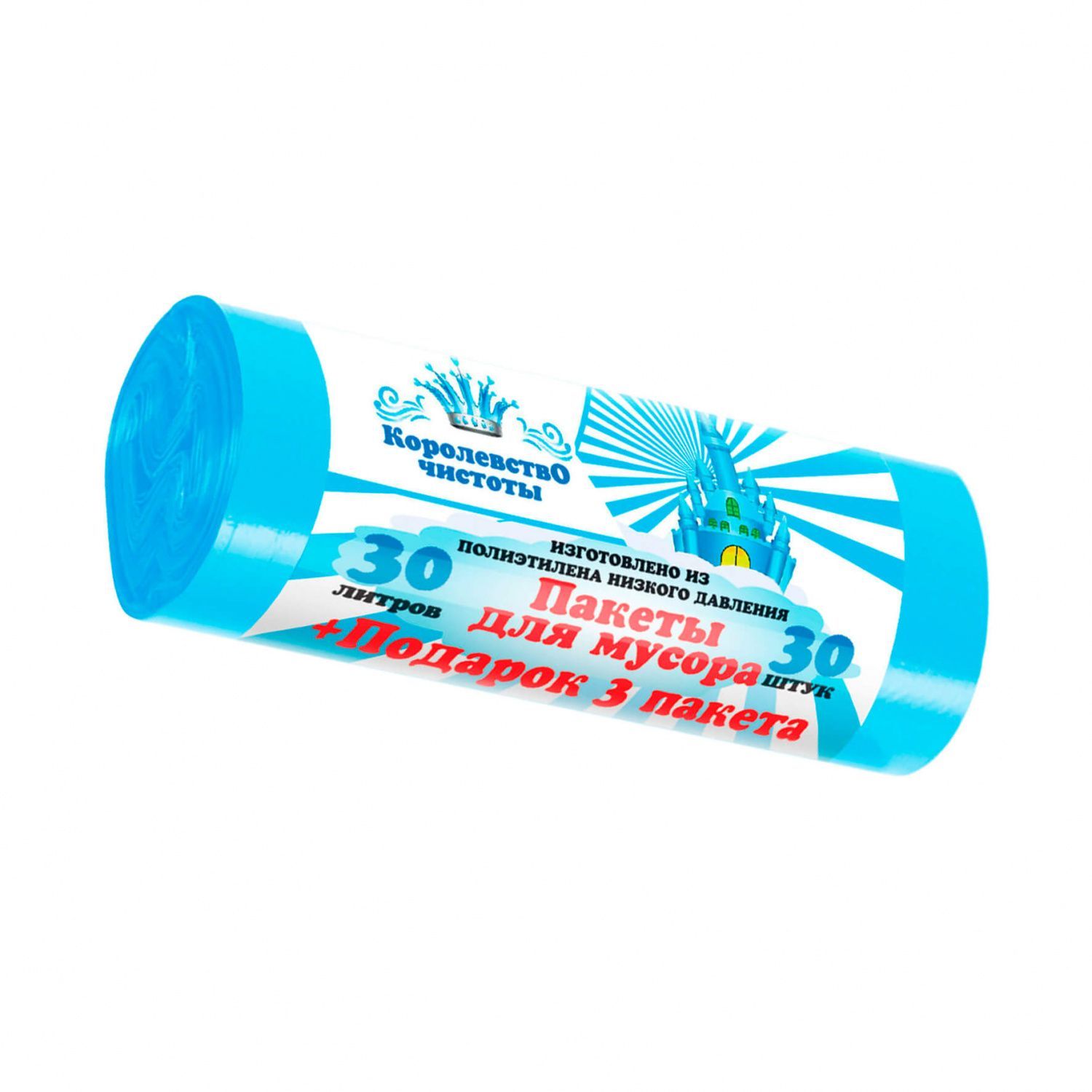 Мешки для мусора 30 л, голубые, в рулоне 30 шт. + 3 пакета в подарок, ПНД, 5 мкм, 560х480 мм, Королевство Чистоты, МК3964 (ПЭКЧ-30-30г)